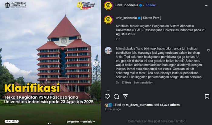 “Mahasiswa dan dosennya sibuk mengampanyekan free Palestine, tapi rektoratnya justru terang-terangan mendukung Zionis.” Akun tersebut menambahkan, “UI! Kampus yang memperjuangkan anti-penjajahan. Memalukan! @univ_indonesia.”
